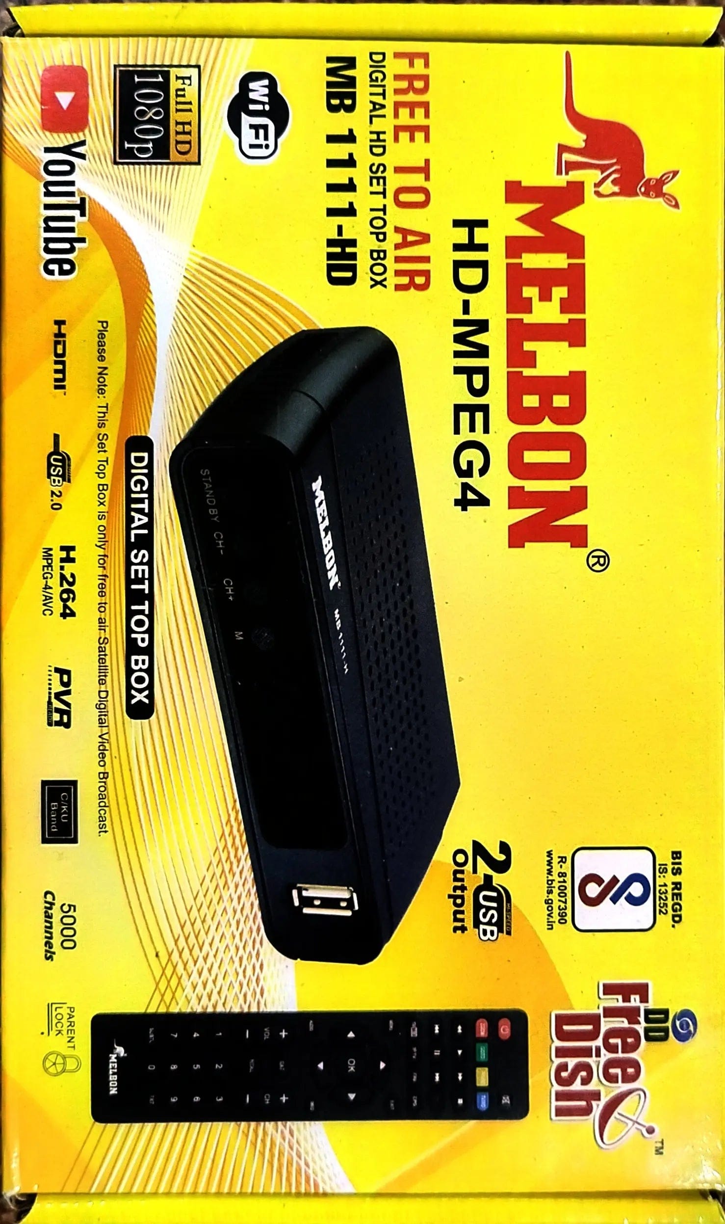 The Melbon MB 1111 Set-Top Box is a high-quality free-to-air (FTA) digital receiver, delivering crystal-clear picture quality with stable signal reception. It supports USB multimedia playback, allowing you to enjoy videos, music, and images directly from a USB drive. With HD output, it enhances your viewing experience, ensuring sharp and vibrant visuals.